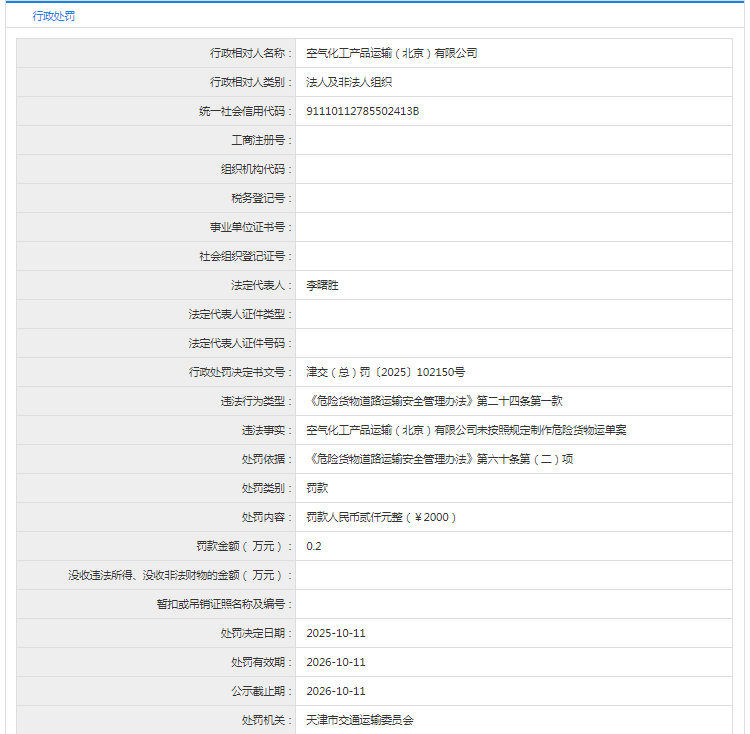 空气化工产品(中国)子公司因同一案由收年内第五罚