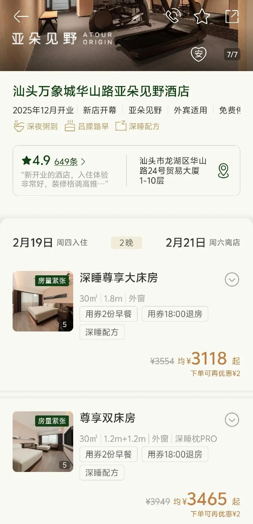各位老板,今年春节都打算去哪潇洒? 反正,我朋友圈里那些年前就嚷嚷着要去潮汕"嗨疯"的朋友们,现在基本都闭麦了,大概率是被酒店账单上的数字给干沉默了。 好家伙,你敢信吗?今年春节,汕头的亚朵酒店,一晚上的价格直接飙到3000块上下。 你没看错,不是海南三亚,不是东北雪乡,而是那个以"好吃不贵"著称的广东汕头。3000块,在平时都能在东南亚往返一趟了,现在只能在汕头睡一觉。 亚朵老用户张雅欣晒出截图,汕头万象城华山路那家亚朵,最低规格的大床房也超过了3000元一晚,城里其他的亚朵价格也在持续上涨。 这价格哪是酒店啊,这简直是新型"春节刺客",专刺那些想去体验"胶己人"风情的文艺青年和吃货们。 一时间,网上骂声一片:"亚朵疯了吧?"、"中端酒店的命,卖着五星级的价"、"这不就是趁节打劫吗?"。 说实话,第一眼看到这价格,光子我也觉得离谱。亚朵,一个主打人文情怀和舒适体验的中高端连锁酒店,平时价格在四五百,撑死七八百。现在直接翻 了五六倍,这吃相确实有点难看。 但往深了扒一扒,发现这锅还真不能全让亚朵背了。 01 不止亚朵,"高烧"席卷整个潮汕 首先,我们得明确一个事实:涨价的,远不止亚朵一家。 打开各大预订平台, ...