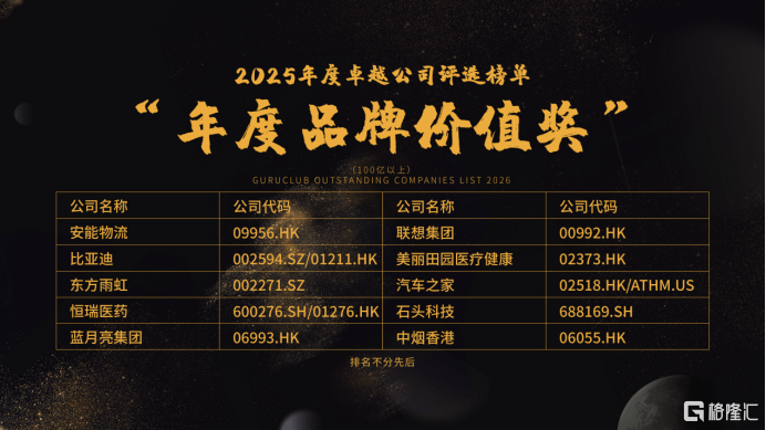 "年度品牌价值奖(大市值)"旨在表彰资本市场中拥有最高品牌价值的企业。品牌作为企业生存和发展 的核心,做好一个品牌,对于每个企业来说都是重中之重。本奖项从品牌差异化、知名度、客户忠诚度 等多角度衡量品牌价值,甄选出的企业都创造了卓越品牌,并在品牌价值提升的过程中做出创新和不凡 实践。本次评选通过定量数据分析和专家评审团等方式得出最终结果。 格隆汇以"全球视野,下注中国"为初衷,本次评选旨在打造出投资圈中最具参考价值的上市公司及独角 兽公司排行榜。此次"金格奖"上市公司评选覆盖港交所、上交所、深交所、纽交所、美国证券交易所、 纳斯达克证券交易所挂牌上市的全部上市公司及独角兽公司。 12月22日,格隆汇在线上举办"科技赋能·资本破局"分享会。本次分享会,备受瞩目的卓越公司评选榜 单将隆重揭晓,其中格隆汇"金格奖"年度卓越公司评选中,安能物流(09956.HK)、比亚迪 (002594.SZ/01211.HK)、东方雨虹(002271.SZ)、恒瑞医药(600276.SH/01276.HK)、蓝月亮集团 (06993.HK)、联想集团(00992.HK)、美丽田园医疗健康(02373.HK)、汽车之家(02518. ...