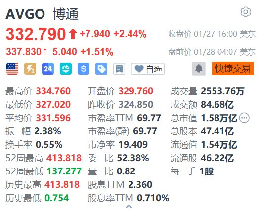 | AVGO 博通 | | | | --- | --- | --- | | 332.790 ↑ +7.940 +2.44% | | 收盘价 01/27 16:00 美东 | | 337.830 + 5.040 +1.51% | | 盘前价 01/28 04:07 美东 | | 一 72 24 号 8 8 同 ♥自选 | | ● 快捷交易 | | 最高价 334.760 | 开盘价 329.760 | 成交量 2553.76万 | | 最低价 327.020 | 昨收价 324.850 | 成交额 84.68亿 | | 平均价 331.596 | 市盈率 TM 69.77 | 总市值 1.58万亿 (... | | 振 幅 2.38% | 市盈率(静) 69.77 | 总股本 47.41亿 | | 换手率 0.55% | 市净率 19.409 | 流通值 1.54万亿 | | 52周最高 413.818 委 比 52.38% | | 流通股 46.22亿 | | 52周最低 137.277 量 比 0.82 | | 色 手 1股 | | 历史最高 413.818 股息TIM 2.360 | | | | 历史最低 ...