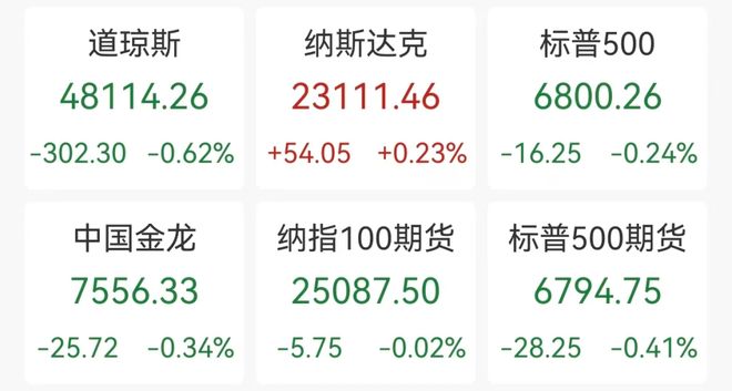 记者丨刘雪莹 编辑丨曾静娇 美东时间周二,美股三大指数仅纳指小幅收涨,标普500指数连续第三个交易日下跌。 | 道琼斯 | 纳斯达克 | 标普500 | | --- | --- | --- | | 48114.26 | 23111.46 | 6800.26 | | -302.30 -0.62% +54.05 +0.23% -16.25 -0.24% | | | | 中国金龙 | 纳指100期货 | 标普500期货 | | 7556.33 | 25087.50 | 6794.75 | | -25.72 -0.34% -5.75 -0.02% -28.25 -0.41% | | | 大型科技股普涨,特斯拉涨超3%,创历史新高,市值一夜增加485亿美元(约合人民币3415亿元),达 1.63万亿美元,超越博通,成为美国市值第七大公司。此外甲骨文涨超2%,Meta涨超1%。 油气、能源板块跌幅居前,英国石油跌超4%。加密货币概念、计算机硬件板块涨幅居前,Hut 8涨近 4%,Strategy、SanDisk涨超3%。 | 1小时爆仓 | $102.33万 | 4小时爆仓 | $1186.87万 | | --- | - ...