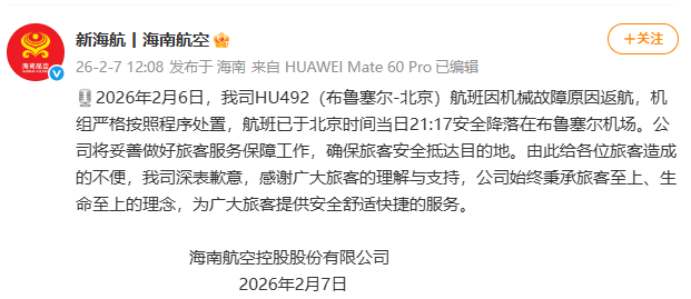 2月7日12时,海南航空发布一则通报: 据悉,飞机风挡破裂属于航空运行中的突发机械故障,可能由高速外来物撞击、热应力变化、结构疲劳或加热系统故障等多种因素引 发。波音787机型的驾驶舱风挡为多层结构设计,外层玻璃为非结构层,此次破裂未对飞行安全造成根本性影响,也印证了民航飞机应急 设计的可靠性。同时,机组在突发情况下的标准化处置,是此次事件无人员伤亡的关键。 来源:@新海航、现代快报、中国民用航空网 涉事航班为波音787-9宽体机,注册号B-1546,机龄7.1年。据悉,涉事HU492航班原计划当地时间2月6日12:20从布鲁塞尔飞往北京。 有乘客在社交平台发文表示,"以为是普通小事故。下了廊桥结果发现是风挡玻璃碎了。"记者在社交平台发现,有多名网友称在飞机上 看到HU492在空中放油,随后飞机返航。还有网友发布了该架飞机前风挡玻璃破裂的照片。 此前报道: 2月7日凌晨,有乘客反映,海南航空HU492航班起飞后返航,疑似因为飞机风挡玻璃破裂导致。 ...