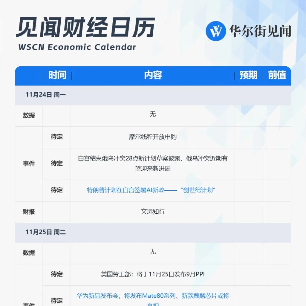 11月23日,美股正在经历黯淡的11月,下周将是11月最后一周,并且周四将因感恩节休市一日。由于前几周的持续低迷,美股本月录得下跌已经很 难避免,不过下周若能录得上涨,将在市场动荡之际增添信心。 近段时间以来,投资者对科技股估值过高的担忧始终挥之不去,即使人工智能(AI)龙头股英伟达公布了一份强劲的财报,也无法彻底打消疑虑。 此外,美联储降息预期受挫也令市场承压。 尽管标普500指数今年仍累计上涨11%,但已较10月末的历史高点回落逾5%。以科技股为主的纳指已连续三周下跌。 未来数周大量积压数据的集中公布,可能进一步加剧市场波动,因为投资者需据此判断经济健康状况,以及美联储是否会在12月会议上降息。 下周美国重要经济数据包括定于周二公布的9月零售销售数据和生产者价格指数(PPI),以及周三的9月耐用品订单。这些数据原定于10月发布, 但因近期联邦政府停摆而推迟。 由于美国劳工统计局已宣布不会发布完整的10月非农就业报告,且11月报告将推迟至12月16日(即美联储会议结束六天后)发布,因此下周三的每 周初请失业金人数数据的重要性可能上升。 美联储的褐皮书(当前经济状况概述)也将于下周三公布。 其他海外地区方面, ...