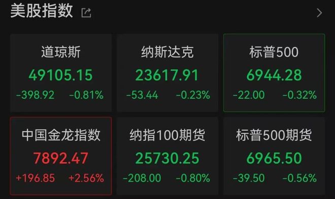 中概股逆势大涨,中国金龙指数涨超2%,金山云涨超16%,知乎涨超15%,阿里巴巴涨近5%,小鹏汽 车涨逾4%,百度涨超3%。 编辑 | 钉钉 | 美股指数 它 | | | | --- | --- | --- | | 道琼斯 | 纳斯达克 | 标普500 | | 49105.15 | 23617.91 | 6944.28 | | -398.92 -0.81% | -53.44 -0.23% | -22.00 -0.32% | | 中国金龙指数 | 纳指100期货 | 标普500期货 | | 7892.47 | 25730.25 | 6965.50 | | +196.85 +2.56% | -208.00 -0.80% | -39.50 -0.56% | 科技股普跌,英特尔跌超3%,英伟达跌近1%。银行股集体下跌,美国运通跌超4%,摩根大通跌逾 2%。 1月12日,美股三大指数开盘下跌,截至发稿,道指跌0.81%,纳指跌0.23%,标普500指数跌0.32%。 ...