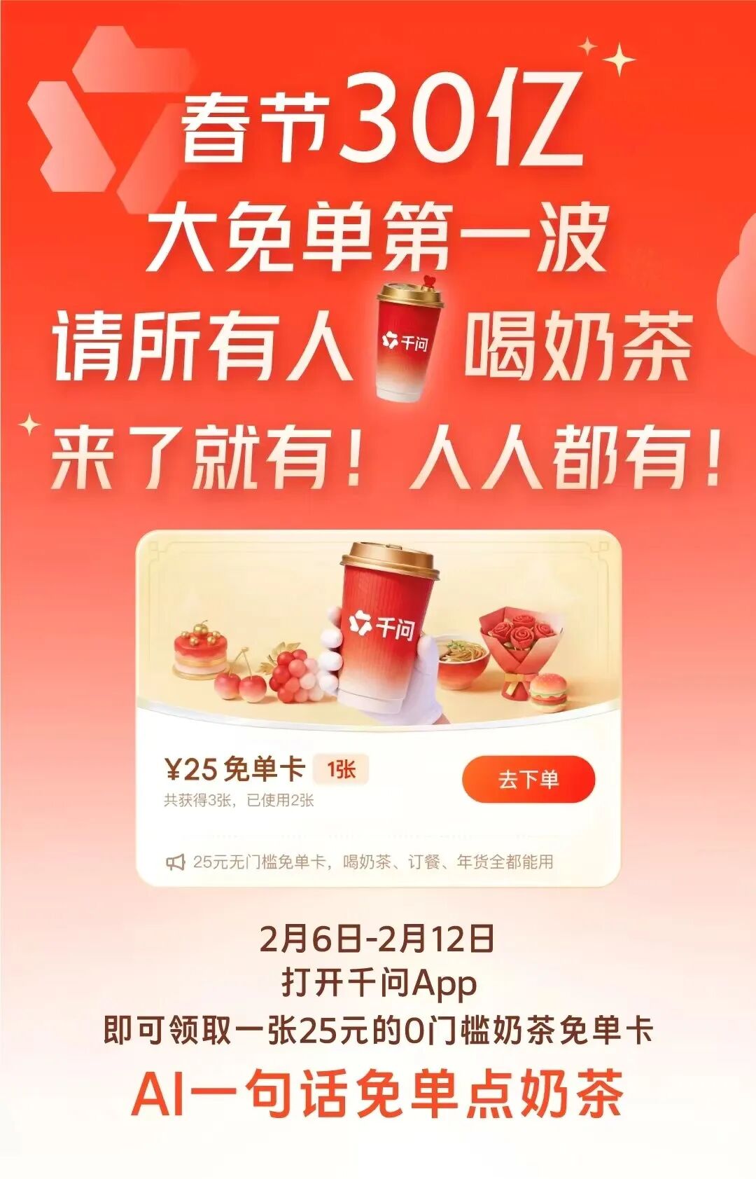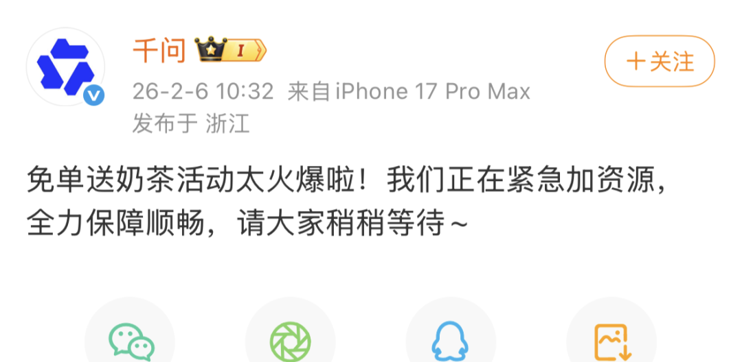 2月6日 阿里千问APP "春节30亿免单"活动 正式上线 今天,你点奶茶了吗? 请全国人民 用AI一句话免费点奶茶 相关话题迅速冲上 热搜榜第一 今天一早 所有办公室的打工人 都在转发0.01元喝咖啡 活动上线5小时 千问APP已经下单 超500万单奶茶 千问~ @千问 微博截图 据官方介绍,千问APP免单卡可在全国30多万家奶茶店使用,蜜雪冰城、瑞幸咖啡、霸王茶姬、奈雪的茶、沪上阿姨、茶百道、库迪咖啡等茶饮咖啡品牌 支持使用。活动期间,每位用户可领取21张无门槛的25元免单卡,相当于525元钱,还有机会抽取价值10000元的千问AI生活卡。活动页面还显示,第二 波福利将于2月13日开启,用户可领取现金红包,最高可得2888元。 今日上午,多位用户在社交媒体晒出用千问APP下单的"第一杯AI奶茶"。根据用户对比,在各家AI应用的红包活动中,千问的玩法简单直接且门槛低。 不过,点奶茶免单活动的火爆导致千问APP一度"崩了",部分用户打开活动页面,发现页面无法点击或者出现卡顿,并显示 "系统开小差了,稍后再试 吧"。 虽然服务器稍显卡顿 但多次尝试后 云南网小编终于薅到了这波"羊毛" 瓜分30亿 智时没有想好喝 ...
