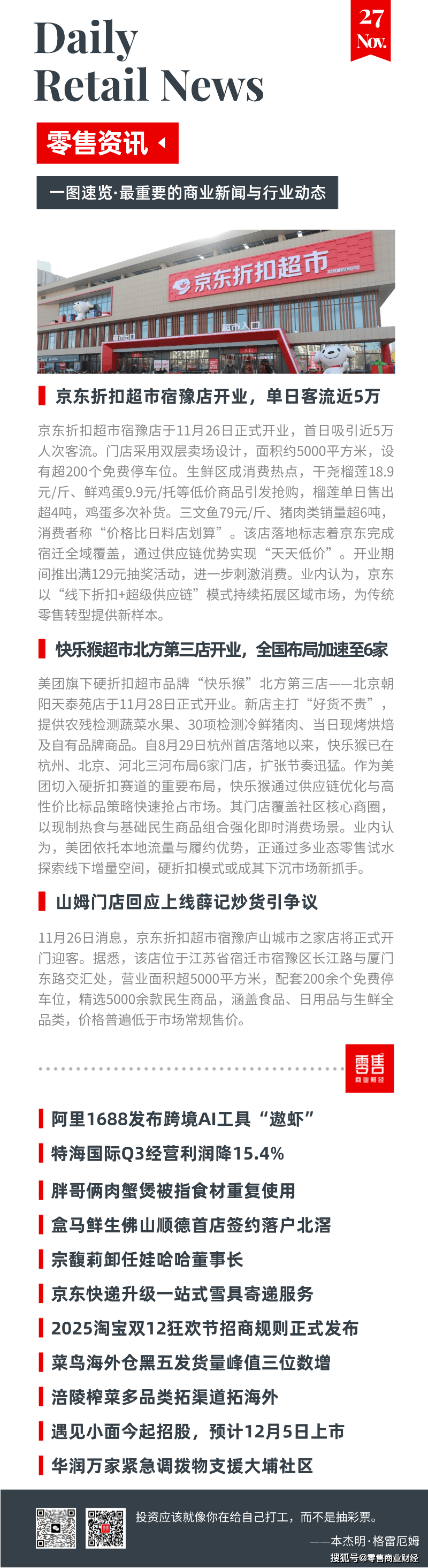 Group 1: JD Discount Supermarket - JD Discount Supermarket in Shuyang opened on November 26, attracting nearly 50,000 visitors on its first day. The store features a two-level design with an area of approximately 5,000 square meters and over 200 free parking spaces [7] - The fresh produce section became a consumer hotspot, with durians priced at 18.9 yuan per pound and fresh eggs at 9.9 yuan per tray, leading to significant sales, including over 4 tons of durians sold in one day [7] - The store's opening signifies JD's complete coverage of Suqian, leveraging supply chain advantages to offer "everyday low prices" [7] Group 2: Happy Monkey Supermarket - Meituan's hard discount supermarket brand "Happy Monkey" opened its third store in northern China on November 28, accelerating its national expansion to six stores [10] - The new store emphasizes "good products at low prices," offering tested vegetables and fruits, fresh pork, and self-branded products [10] - Happy Monkey's rapid market capture is attributed to supply chain optimization and high-cost performance strategies, focusing on community core business districts [10] Group 3: Sam's Club Controversy - Sam's Club faced criticism for introducing two products from Xueji Fried Goods, with some consumers questioning the frequency of common product introductions in a membership-based store [11] - A staff member clarified that the products were priced lower than at Xueji's stores and were conveniently packaged for transport [11] Group 4: Alibaba's Cross-Border AI Tool - Alibaba's 1688 platform launched a cross-border e-commerce AI tool named "Ao Xia," which provides one-stop supply chain services for small and medium-sized businesses [11] - The tool enhances product selection efficiency to the top 20% of human buyers and boasts an 80% inquiry task resolution rate [11] Group 5: Tehai International Q3 Performance - Tehai International reported a 7.8% year-on-year revenue increase to $214 million in Q3 2025, with same-store sales up 2.3% to $182 million [12] - However, operating profit fell by 15.4% to $12.6 million, with a profit margin of 5.9%, primarily due to increased foreign exchange losses [12] Group 6: Hema Fresh Store Expansion - Hema Fresh signed a contract to open its first store in Shunde, Foshan, expanding its presence in Guangdong [14] Group 7: Wahaha Leadership Change - Zong Fuli has stepped down as chairman of Wahaha, with Xu Simin taking over the role, while Zong retains a 29.40% stake in the company [16] Group 8: JD Express Service Upgrade - JD Express upgraded its one-stop ski equipment delivery service in response to the early start of the ice and snow season, offering customized packaging and free storage for seven days [16] Group 9: Taobao Double 12 Festival - The 2025 Taobao Double 12 Festival's promotional rules were released, with the event scheduled from December 8 to December 12, featuring official discounts [17] Group 10: Cainiao's Black Friday Performance - Cainiao's overseas warehouses experienced a three-digit percentage increase in daily shipping volume during Black Friday, with order processing capacity nearly tripling [18] Group 11: Fuling Mustard's Market Strategy - Fuling Mustard plans to expand its product matrix and channels while continuing to develop overseas markets to drive overall sales [20] Group 12: Encountering Small Noodles IPO - Guangzhou Encountering Small Noodles began its IPO process, planning to list on the Hong Kong Stock Exchange on December 5, with a share price range of 5.64 to 7.04 HKD [21] Group 13: China Resources' Emergency Relief - China Resources initiated an emergency relief plan to support the Dapu community in Hong Kong, providing over 5,000 essential supplies to residents affected by recent disasters [22]