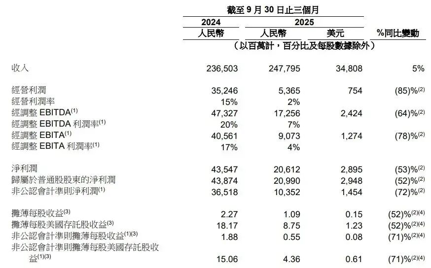 来源:电商天下 作者 | 文韬 如果把今年形容为"阿里的重启年",一点都不夸张。 11月25日晚,阿里公布了2026财年中期成绩单。 乍一看,这份财报并不好看:实现营收2477.95亿元,同比增长5%;经营利润53.65亿元,同比下降85%;归属于普通股股东的净利润为209.9亿 元,同比下降52%。 | | | 截至9月30日止三個月 | | | | --- | --- | --- | --- | --- | | | 2024 | 2025 | | | | | 人民幣 | 人民幣 | 美元 | %同比雙動 | | | | (以百萬計,百分比及每股數據除外) | | | | 收人 | 236,503 | 247.795 | 34.808 | 5% | | 經營利潤 | 35.246 | 5.365 | 754 | (85)%(2) | | 經營利潤率 | 15% | 2% | | | | 經調整 EBITDA(1) | 47,327 | 17,256 | 2.424 | (64)%(2) | | 經調整 EBITDA 利潤率(1) | 20% | 7% | | | | 經調整 EBITA(1) | 40.56 ...