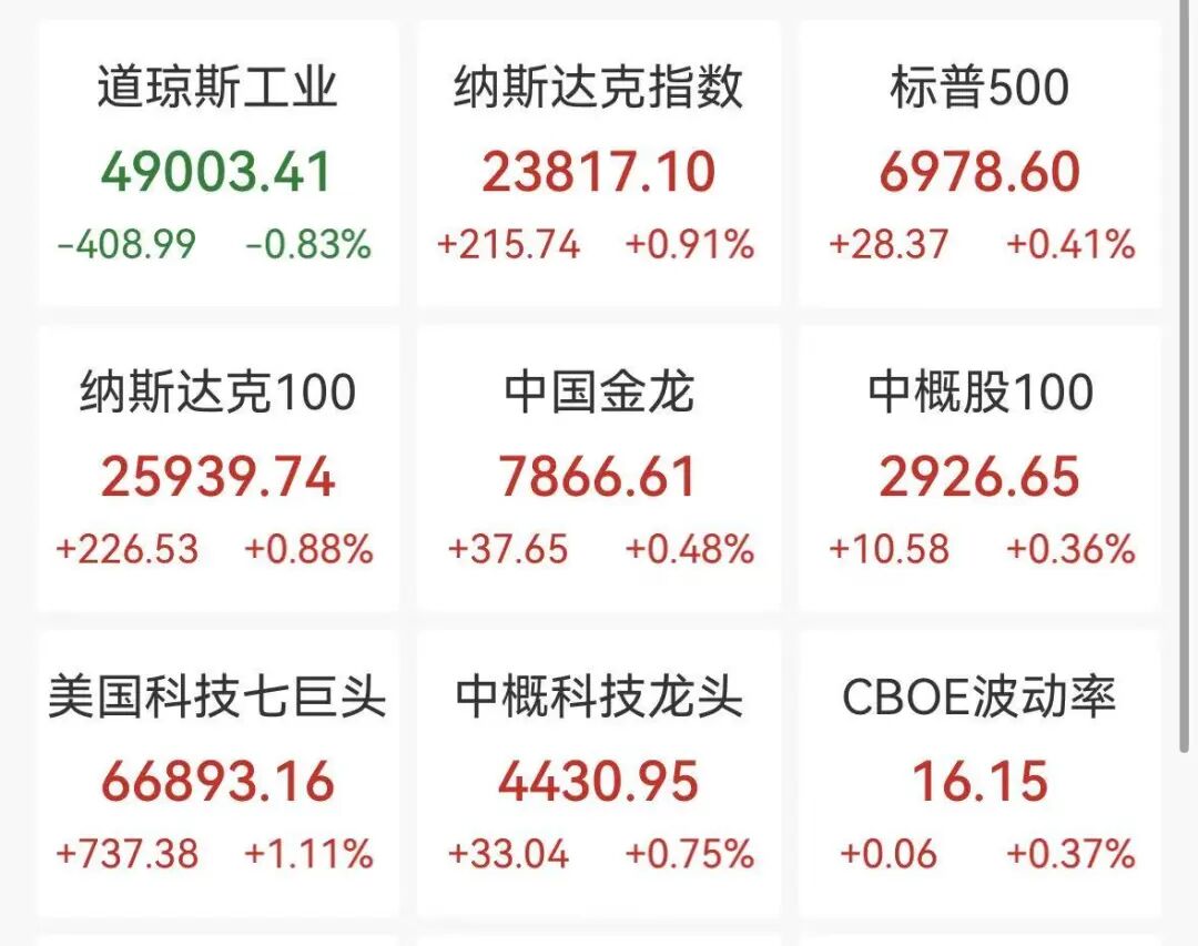 加密货币全线上涨,比特币重回89000美元上方。 周二(1月27日),美国三大股指收盘涨跌不一,科技股表现强劲带动纳指和标普上涨。截至收盘,道指跌0.83%报49003.41点,标普500指数涨0.41%报 6978.6点,纳指涨0.91%报23817.1点。 | 道琼斯工业 | 纳斯达克指数 | 标普500 | | --- | --- | --- | | 49003.41 | 23817.10 | 6978.60 | | -408.99 -0.83% +215.74 +0.91% +28.37 +0.41% | | | | 纳斯达克100 | 中国金龙 | 中概股100 | | 25939.74 | 7866.61 | 2926.65 | | +226.53 +0.88% +37.65 +0.48% +10.58 +0.36% | | | | 美国科技七巨头 中概科技龙头 CBOE波动率 | | | | 66893.16 | 4430.95 | 16.15 | | +737.38 +1.11% +33.04 +0.75% +0.06 +0.37% | | | 科技七巨头中六家上涨,英伟达、苹果涨超1%,微软 ...