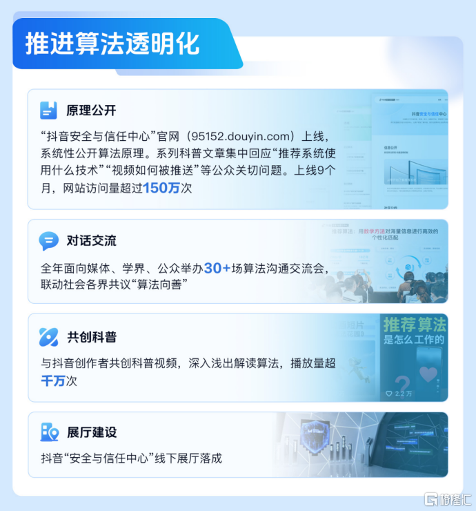 2026年1月21日,抖音举办2026安全与信任大会,并发布《2025抖音安全与信任年度报告》,介绍一年 来抖音平台治理及透明化工作的进展。 《报告》披露了平台在算法公开、治理探索、价值创造和用户服务领域的相关工作。《报告》显示, 2025年,抖音上线安全与信任中心网站(95152.douyin.com),全面公开抖音算法原理,对公众关切的 问题逐一解答;并举办30余场与媒体、学界的算法沟通会,倾听诉求、回应问题、吸纳建议。 在加强平台治理能力上,通过将大模型技术引入谣言治理,抖音平台谣言内容曝光量与年初相比下降 90%;针对争议热点信息传播、AI生成内容、恶意营销号等平台治理新兴问题,抖音创新性推出《社区 热点信息和账号治理规则(试行)》等7项治理类规范,守护社区内容生态。 算法与治理公开:多渠道打破壁垒、吸纳建议 2025年1月,抖音宣布将推出10项措施,推动平台工作透明化。首先被提及的即推进算法和平台治理透 明化。 抖音内容运营负责人李翔宇在大会上介绍,过去一年,以安全与信任中心网站为载体,抖音全面公开了 算法的核心逻辑、所采用的主要模型。同时,网站也针对"平台如何看待信息茧房""网红是不是被平台 推出 ...