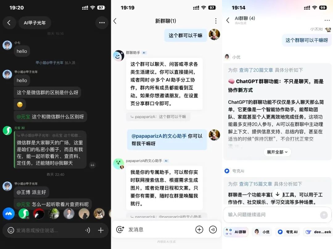 最近,国内曾经的互联网三巨头"BAT",罕见地在同一时间窗口内,对"AI群聊"这个产品形态给出了几乎同步的回应:腾讯上线"元宝派";百度文心内测 多角色群聊;阿里旗下UC浏览器推出多智能体群聊…… 在互联网产品史上, 这种"默契"通常意味着巨头已经嗅到了某种范式转移的气息,也让行业不得不重视"AI群聊"这个看似平平无奇的产品形态。 "AI群聊"的风是从大洋彼岸吹过来的。 2024年12月,ChatGPT开始在部分地区测试群聊功能,并在2025年11月20日全球上线。紧随其后,微软以及国内互联网巨头相继加速推进多智能体、多角 色协作的群聊功能。 群聊,从一个原本属于社交产品的基础功能,突然被放置在了AI时代的核心位置。这并非偶然。技术层面,大模型已具备多轮理解与复杂协作的基础能 力;市场层面,纯Chatbot的叙事逐渐乏力,多Agent协作成为新故事。 由此指向一个根本问题:AI时代的"超级入口",到底会以什么形态出现? 移动互联网的入口之争,围绕的是搜索、浏览器、社交与信息流。今天,在大模型能力趋同、单一Chatbot产品逐渐同质化的背景下,AI群聊,或许就是 大厂们针对"AI超级入口"的一次关键卡位。 1. ...