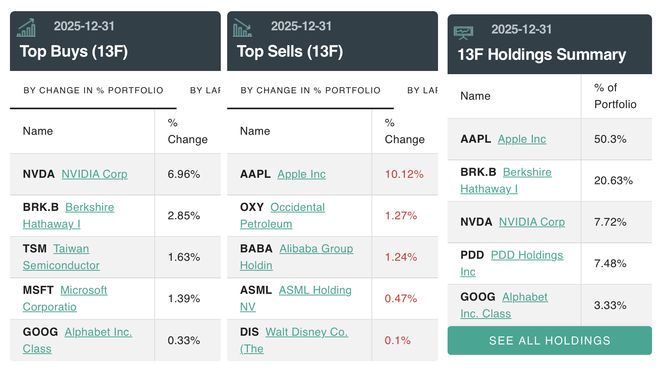 | 2025-12-31 | | 2025-12-31 | | 2025-12-31 | | | --- | --- | --- | --- | --- | --- | | Top Buys (13F) | | Top Sells (13F) | | 13F Holdings Summary | | | BY CHANGE IN % PORTFOLIO | BY LAF | BY CHANGE IN % PORTFOLIO | BY LAF | Name | % of | | | | | | | Portfolio | | Name | 9/2 | Name | 0/0 | | | | | Change | | Change | AAPL Apple Inc. | 50.3% | | NVDA NVIDIA Corp. | 6.96% | AAPL Apple Inc. | 10.12% | BRK.B Berkshire | 20.63% | | | | | | Hathaway I | | | BRK.B Berkshire | 2.85% | OXY Occidental | 1.27% | NVDA ...
