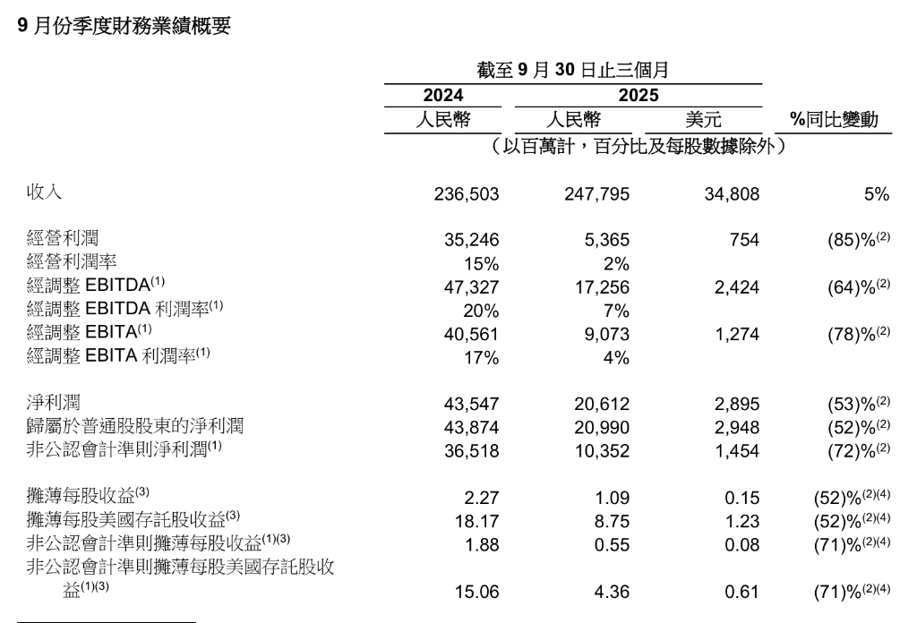 Core Viewpoint - Alibaba's latest financial report indicates a mixed performance with revenue growth but significant declines in net profit and adjusted earnings [1][2]. Financial Performance Summary - For the quarter ending September 30, 2025, Alibaba reported revenue of 247.795 billion RMB, representing a 5% year-over-year increase [1][2]. - The net profit attributable to ordinary shareholders was 20.990 billion RMB, down 52% compared to the previous year [2]. - Non-GAAP net profit fell by 72% to 10.352 billion RMB from 36.518 billion RMB in the same quarter of 2024 [2]. - Operating profit decreased by 85% to 5.365 billion RMB, with an operating margin of only 2% [2]. - Adjusted EBITDA also saw a significant decline of 64%, amounting to 17.256 billion RMB, with an adjusted EBITDA margin of 7% [2]. Cloud and AI Performance - Alibaba Cloud's overall revenue grew by 34%, with AI-related product revenue achieving triple-digit year-over-year growth for nine consecutive quarters [2]. - The company's capital expenditures for the quarter were 31.5 billion RMB, totaling approximately 120 billion RMB in capital expenditures related to AI and cloud infrastructure over the past four quarters [2]. Market Reaction - Following the earnings report, Alibaba's stock rose over 4% in pre-market trading [3].