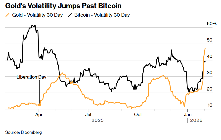 智通财经APP获悉,最新统计数据显示,金融市场波动率层面惊现里程碑式超越动态——长期以来有着"避险之王"称号的传统 稳健避险资产黄金的波动率已经超越长期以"剧烈波动"而著称的全球最大市值加密货币比特币,凸显出黄金在经历了无比猛烈 的涨势后,价格波动愈发剧烈,达到了过去二十年最动荡时刻的水平。 与此同时,华尔街金融巨头们在黄金陷入暴跌轨迹以及剧烈波动之际,仍然在美元贬值趋势、发达市场债务无序扩张以及地缘 政治局势持续动荡的大背景之下坚持看好黄金长期投资前景。即使黄金价格在沃什获提名美联储主席导致的"鹰派冲击"导火索 之下于上周五经历40年来最惨烈跌势,且周一继续大幅下跌——周一现货黄金价格跌幅一度接近10%,摩根大通与美国银行坚 持认为黄金在2026年年底之前有望冲高至6000美元。 根据机构汇编的最新数据,黄金价格的"30天期限波动指标"已大幅升至44%以上,一举创下2008年全球金融危机以来的最高水 平,超过了比特币大约39%的波动指标。比特币通常被称为"数字黄金"且长期以来波动率非常剧烈,长期位列全球波动率最高 的资产。 从另一方面偏向多头的角度来看,大宗商品的波动率飙升态势更常见于历史牛市阶段,这也意味 ...