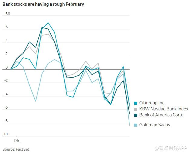近期围绕人工智能的负面预期持续扰动市场。支付公司Block(XYZ.US)宣布因AI效率提升裁员40%,加 剧了投资者对技术进步可能带来大规模就业流失的担忧。本周稍早一份有关AI或对经济与就业产生深 远影响的报告,也放大了市场焦虑情绪。 与此同时,信贷风险的抬头进一步冲击金融股。对经济周期更为敏感的消费金融机构表现尤为疲弱,美 国运通(AXP.US)、第一资本信贷(COF.US)和Synchrony Financial(SYF.US)均位列跌幅前列。 私人信贷领域的动荡同样令投资者不安。去年多笔知名贷款出现损失后,相关投资工具的赎回请求增 加。周五,两只上市的私人信贷基金宣布削减分红,进一步加剧市场对潜在坏账上升的担忧。 在人工智能冲击与高风险信贷担忧交织之下,美国银行板块周五遭遇重挫,多家大型银行和投行股价大 幅下跌,反映出投资者对经济前景的不安情绪升温。 美国银行(BAC.US)跌超4%,花旗集团(C.US)和富国银行(WFC.US)均收跌逾5%,摩根士丹利(MS.US)跌 超过6%,高盛集团(GS.US)跌超7%,而美国最大银行摩根大通(JPM.US)下跌1.9%。衡量银行板块表现 的KBW银行指数ET ...