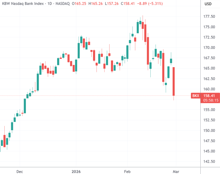 AI+信贷风险重挫银行板块 KBW银行指数ETF(KBE.US)创去年关税风波以来最大单日跌幅