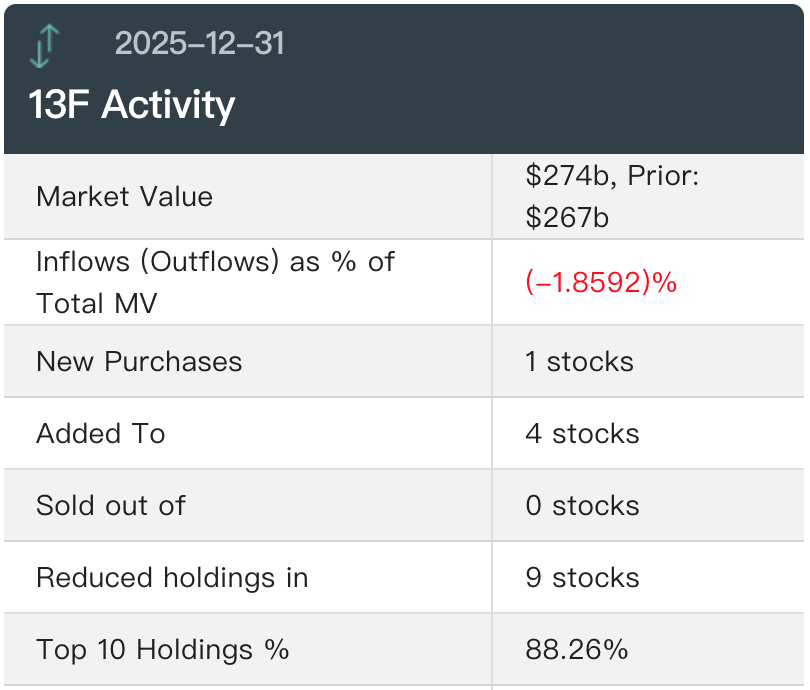 近期,华尔街13F报告陆续出炉,金融巨鳄们最新动向最新大曝光。 其中,股神巴菲特在最后任期继续减持苹果、美银等重仓股;高瓴HHLR四季度增持阿里、拼多多等;此前,桥水Q4增持 英伟达、亚马逊等AI热门股。 巴菲特收官"之作" 当地时间2月17日美股盘后,伯克希尔向美国证监会(SEC)披露了最新13F文件。 在巴菲特担任CEO的最后一季度,伯克希尔继续调整科技巨头持仓,减持多只重仓股的同时,首次建仓传统媒体纽约时 报。 截至2025年四季度末,伯克希尔的十大重仓股分别是:苹果、美国运通、美国银行(核心股)、可口可乐、雪佛龙、穆迪 (排名从第七升至第六)、西方石油(排名从第六降至第七)、瑞士安达保险、卡夫亨氏、谷歌母公司Alphabet。 伯克希尔连续第三个季度减持苹果。 第四季度抛售苹果超过1029万股,持股数环比第三季度减少4.32%,季末苹果持仓市值环比减少约28亿美元,持仓在伯克希 尔投资组合中的占比从三季度的22.69%降至22.60%。 以环比减少的市值看,苹果是伯克希尔2025年第四季度减持最多的个股。 纽约时报是伯克希尔四季度唯一新建仓的个股。 伯克希尔买入数量为506.7万股,持仓市值为3.52 ...