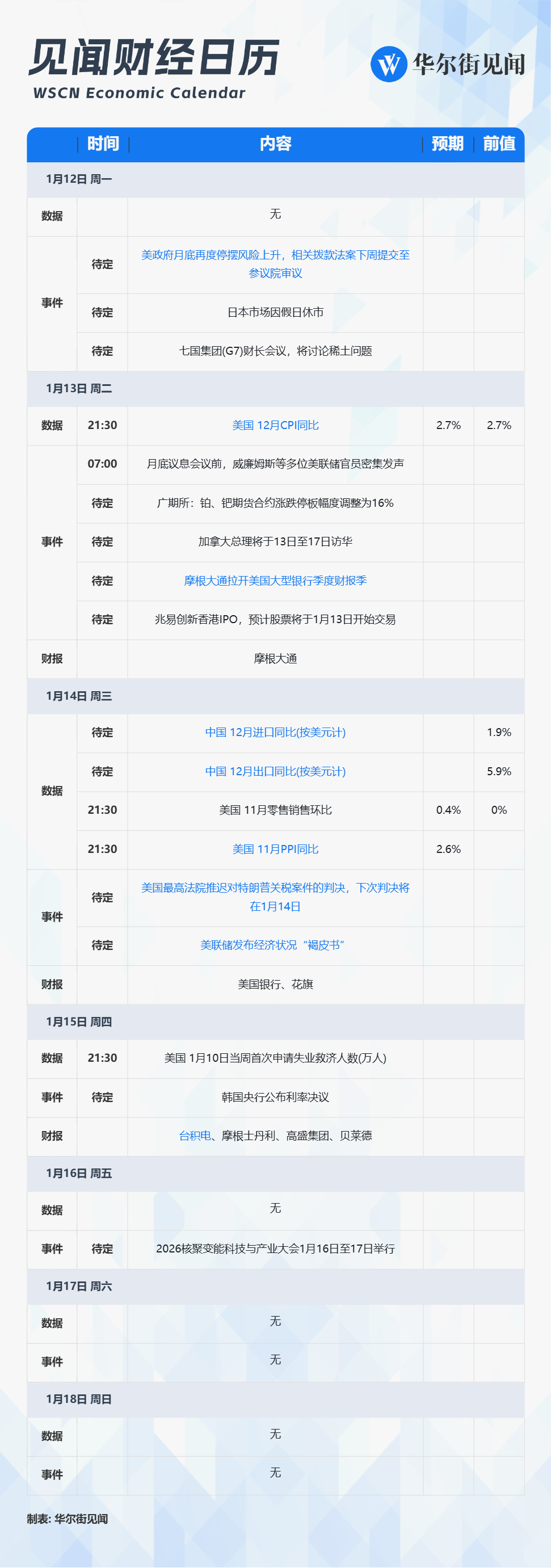 2026《见闻历》企业定制 ⏳现已进入最后征集阶段,名额有限,识别二维码咨询详情 | 时间 | | 内容 | 预期 | 前值 | | --- | --- | --- | --- | --- | | 1月12日 周一 | | | | | | 数据 | | 元 | | | | 待定 | | 美政府月底再度停摆风险上升,相关拨款法案下周提交至 | | | | | | 参议院审议 | | | | 事件 | 待定 | 日本市场因假日休市 | | | | 待定 | | 七国集团(G7)财长会议,将讨论稀土问题 | | | | 1月13日 周二 | | | | | | 数据 | 21:30 | 美国 12月CPl同比 | 2.7% | 2.7% | | 07:00 | | 月底议息会议前,威廉姆斯等多位美联储官员密集发声 | | | | 待定 | | 广期所:铂、把期货合约涨跌停板幅度调整为16% | | | | 事件 | 待定 | 加拿大总理将于13日至17日访华 | | | | 待定 | | 摩根大通拉开美国大型银行季度财报季 | | | | 待定 | | 兆易创新香港IPO,预计股票将于1月13日开始交易 | | | ...
