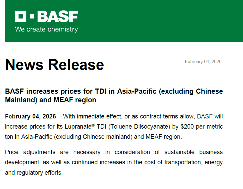 2.选择→发消息 3.输入查询产品信息,如"TDI+ 您的联系方式,我们将及时回复。 慧正资讯,2026年2月4日,BASF宣布,自即日起或按合同条款执行,其Lupranate®TDI(甲苯二异氰酸酯)在亚太地区(不含中国 大陆)及MEAF地区价格上调200美元/吨。BASF表示此次调价直指成本端压力,其明确表示,运输、能源及合规成本的持续上升是 核心动因,可持续业务发展的考量也进一步推高了生产与运营成本。 巴斯夫海外调价显示当前全球TDI产业格局重构,海外成本压力与供应收缩将长期存在,而中国TDI产业凭借产能、成本与产业链优 势,全球市场话语权将持续提升。近年来海外多地TDI装置因环保标准升级、运行成本高企等因素陆续关停或减产,印度GNFC、韩 国韩华等企业装置频繁临停。2026年1月全球TDI装置停车检修总量占全球总产能的24%,海外市场供应缺口持续扩大。作为全球TDI 寡头企业之一,巴斯夫的调价行为也将进一步带动海外市场价格上行,加剧全球市场的价格分化。 中国TDI产业正迎来产能扩张与出口爆发的双重红利。近年来国内TDI产能持续快速增长,万华化学福建基地36万吨/年新增产能顺利 投产,科思创上海基地也完 ...
