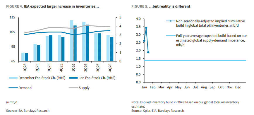 据追风交易台,在"原油将迎来史诗级过剩"的共识声浪中,巴克莱给出了一个明显逆市场的判断:眼下市场所担忧的供给过剩, 规模被高估、持续时间被夸大,而真正重要的变化,发生在2026年之后。 在巴克莱看来,当前并不是原油熊市的起点,而更像是多年上行周期前的"最后一次情绪错配"。 市场为何会误判?"过剩叙事"本身就站不住脚 过去一年,市场反复引用 IEA、EIA 的供需预测,认为 2026 年全球原油市场将出现 00–400 万桶/日的供给过剩。但巴克莱强调, 如果过剩真实存在,应当首先反映在库存之中。 然而,现实数据并不支持这一判断,巴克莱认为,现实数据并不支持这一判断。 第一,所谓"4百万桶/日过剩",在现实中根本没有出现。 无论是陆上商业库存,还是海上浮仓、在途原油,都明显低于这些模型所暗示的水平。价格本身也给出了答案——布 伦特油价并未跌入市场反复预期的40–50美元区间,而是表现出明显韧性。 巴克莱指出,市场并非在"算错供给",而是在系统性低估需求的绝对水平。不同机构对2026年原油需求的"起点"本 身,差异就高达200万桶/日以上。所谓"缺失的桶",并没有消失,而是被统计口径和数据滞后掩盖了。 第三,炼厂 ...