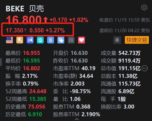 | BEKE 贝壳 | | | | --- | --- | --- | | 16 800 + +0.170 +1.02% | | 收盘价 11/19 15:59 美东 | | 17.350 + 0.550 +3.27% | | 盘前价 11/20 04:22 美东 | | 三五 24 4 8 8 8 日 0 | | ● 快捷交易 | | 最高价 16.955 | 开盘价 16.630 | 成交量 542.73万 | | 最低价 16.595 | 昨收价 16.630 | 成交额 9119.4万 | | 平均价 16.802 | 市空室 M 40.19 | 总市值 191.15亿 (1) | | 振 幅 2.17% | 市盈率(静) 34.64 | 总股本 11.38亿 | | 换手率 0.79% | 市净率 2.003 | 流通值 115.73亿 | | 52周最高 24.648 | 委 比 -98.75% | 流通股 6.89亿 | | 52周最低 15.385 | 量 比 1.06 | 色 手 1股 | | 历史景高 75.056 | 股息TIM 0.368 | 换股比率 3.00 | | 历史最低 6. ...
