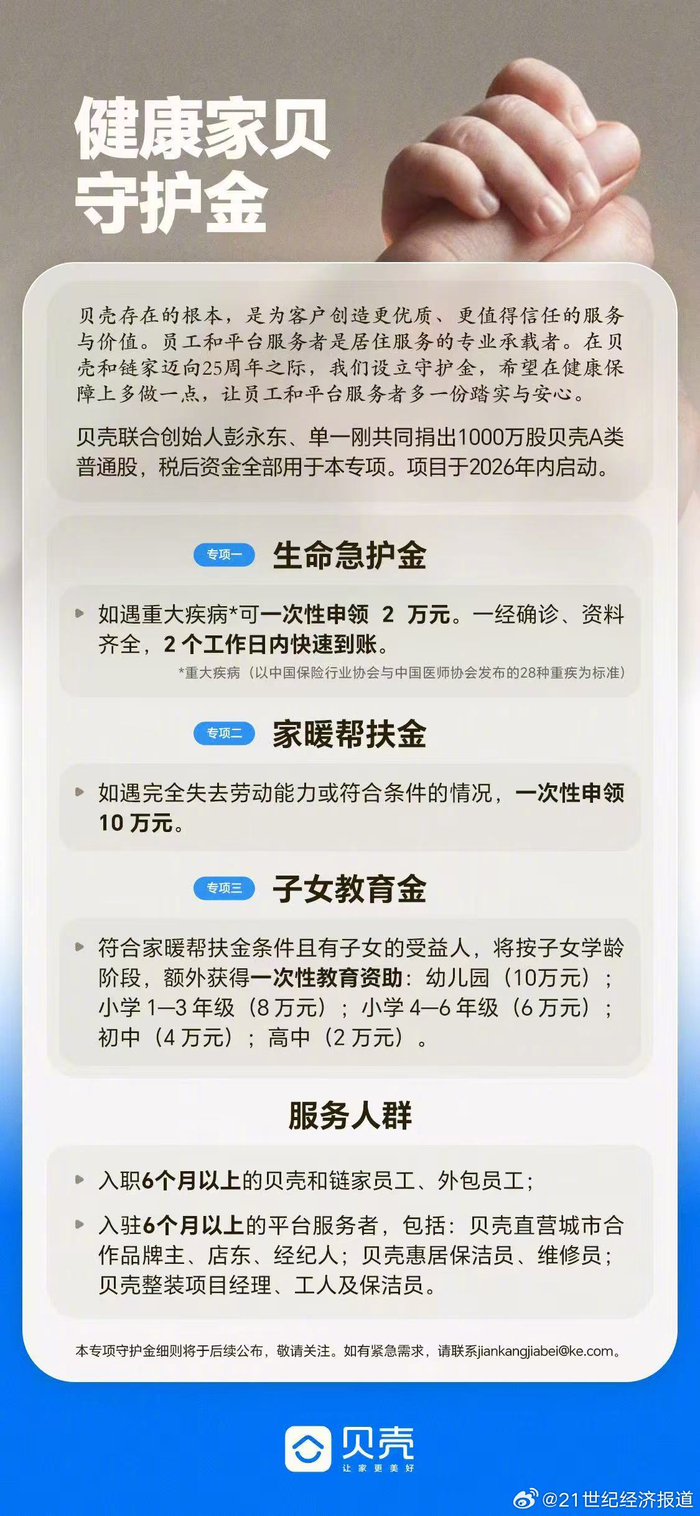 #贝壳为50万服务者设4亿守护金# 2月24日,贝壳联合创始人彭永东和单一刚在贝壳和链家迈向25周年 之际,共同捐赠1000万股A类贝壳普通股,税后资金将用于设立"健康家贝守护金",保障全员和服务者 约50万人。如确诊重疾,2个工作日内快速申领到账2万元;如完全失去劳动能力,获10 万元补贴,并 按子女学龄获2-10万元教育资助。按2月23日收盘价,该笔捐赠价值约4亿元,贝壳联合创始人一年内捐 赠达8.4亿元。 服务人群 本专项守护金细则将于后续公布,敬请关注。如有紧急需求,请联系jiankangjiabei@ke.com。 63 @21世纪经济报道 入职6个月以上的贝壳和链家员工、外包员工; D ▶ 入驻6个月以上的平台服务者,包括:贝壳直营城市合 作品牌主、店东、经纪人;贝壳惠居保洁员、维修员; 贝壳整装项目经理、工人及保洁员。 符合家暖帮扶金条件目有子女的受益人,将按子女学龄 阶段,额外获得一次性教育资助:幼儿园(10万元); 小学 1-3年级(8万元);小学 4-6年级(6万元); 初中(4万元);高中(2万元)。 ...