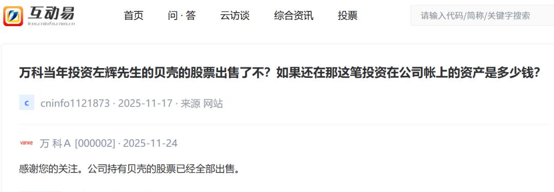 据深交所互动易信息,11月24日,万科A官方回复投资者提问时表示:"公司持有贝壳的股票已经全部出售。" 图源:深交所互动易 01 万科投资贝壳的时间可以追溯到2017年4月19日,这个时间点是在贝壳组建之前。万科以30亿元投资链家集团,获得约7.2%股权,其中26亿元入股链家地 产,4亿元入股链家系另一公司。后续经过链家D轮融资稀释,万科的持股占比下降到了约5.5%。 2018年4月,链家重组为贝壳找房。不久之后,万科持有的链家股权被按比例转换为贝壳股份。 | 披露日期 | 融资轮次 | 融资金额 | | 企业估值 | 比例 | 投资方 | | --- | --- | --- | --- | --- | --- | --- | | 2018-01-01 | 股权融资 | 未披露 | | | | 顾义创新产业发展基金 | | 2017-11-07 | 战略融资 | 未披露 | | | | 新希望 | | | | | | | | 新希望集团,染壹资本 | | | | | | | | 新希望集团 | | | | | | | | 染膏资本 | | 2017-11-20 | 战略融资 | 未披露 | | | | 高瓴资 ...