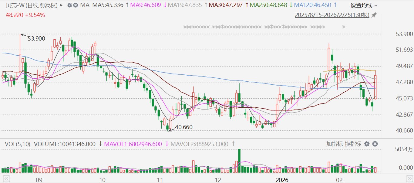另外,上海发布楼市"沪七条" 进一步调减住房限购政策。为更好满足居民刚性和改善性住房需求,促 进房地产市场平稳健康发展,2月25日,上海市市住房城乡建设管理委、市房屋管理局、市财政局、市 税务局、市公积金管理中心等五部门联合印发《关于进一步优化调整本市房地产政策的通知》,自2026 年2月26日起施行。(格隆汇) | BEKE 贝壳 | | | | --- | --- | --- | | 17 100 ↑ +0.210 +1.24% | | 收盘价 02/24 16:00 美东 | | 17.740 + 0.640 +3.74% | | 盘前价 02/25 04:02 美东 | | 三 四 图 图 图 图 日 中 | | ● 快捷交易 | | 最高价 17.230 | 开盘价 16.850 | 成交量 420.92万 | | 最低价 16.840 | 昨收价 16.890 | 成交额 7202.71万 | | 平均价 17.111 | 市空室 39.58 | 总市值 198.62亿 (m) | | 振 幅 2.31% | 市盈率(静) 34.13 | 总股本 11.62亿 | | 换手率 0.62% | 市净 ...