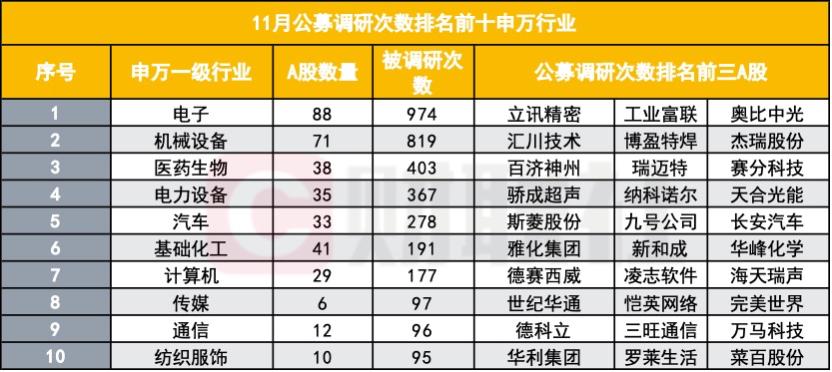 尽管A股在11月整体延续震荡下行走势,市场情绪偏谨慎,但公募机构的调研热情并未减弱。数据显示,11月共有154 家公募基金参与A股市场调研,累计调研次数达4298次,覆盖506只个股,触及30个申万一级行业。 与市场表现形成鲜明对比的是,这些被调研的个股整体韧性显著,不仅跑赢同期沪深300指数1.89个百分点,更有186 只实现正收益,其中涨幅超10%的个股达66只。 其中,华盛锂电以132.48%的单月涨幅拔得头筹,成为11月涨幅最大的调研标的。该公司所属的电力设备行业也在本 月强势表现,入围涨幅前十的还有海陆重工与丰元股份。另一条涨幅与调研高频重合的主线是电子行业,中富电路与 东芯股份均涨幅居前,同时分别被调研23次与34次,在高频调研榜单上也赫然在列。以此为线索,调研方向与股价表 现的交叉点,或已勾勒出聪明钱正在关注的两大主线。 调研高频聚焦电子与机械设备,聪明钱前瞻布局产业链细节 从行业分布来看,11月公募调研活动呈现出明显的聚焦效应。电子行业以974次调研居于首位,调研覆盖88只个股,行 业内最受关注的是立讯精密、工业富联和奥比中光。三家公司不仅均位列调研频次前十,其中立讯精密更是被调研142 次, ...