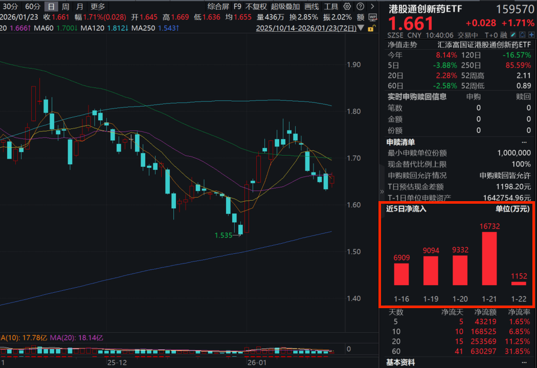 今日(1.23),港药强势反攻,创新药纯度100%的港股通创新药ETF(159570)涨近2%,成交额快速突破7亿元!资金面上,近5日累计净流入超4.3亿 元!最新规模超251亿元,同类规模领先! 2026 JPM召开,中国创新药再次成为亮点。恒瑞医药目标26年创新药收入增长25%+,未来两年多款重磅药/适应症获批,管线厚度孕育未来持续 BD;百济神州26年预计实体瘤领域多个已经POC资产将推至注册临床;中国生物制药披露TYK2数据,治疗UC数据亮眼,并且大会期间收购赫吉亚 布局小核酸;迪哲医药披露四代EGFR TKI治疗3代EGFR TKI治疗失败NSCLC的数据,疗效方面,ORR达60%,mPFS>10m,并且安全性优异。(东 吴证券20260118《JPM 2026最前线观察:中国创新药再次成为全球焦点!》) 本届JPM大会中国药企凭借ADC、IO双抗、GLP-1等领域的技术突破,通过Licenseut及合作开发等方式走向全球。百济神州等龙头已实现组织出海, 部分Biotech实现细分领域突破。整体看,中国医药产业正站在全球化价值重估的起点,2026年将成为验证转型成效的关键节点。 国内药企技术快速突破 ...