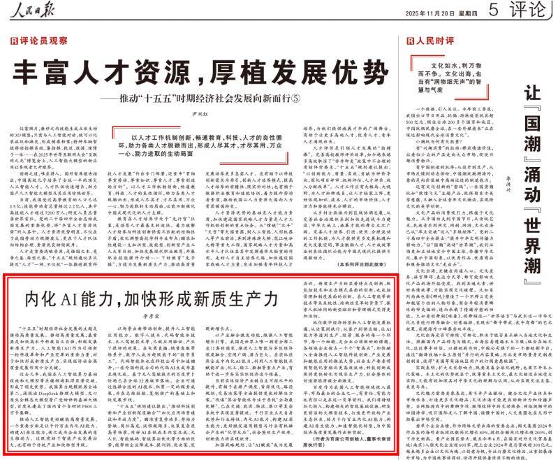 百度创始人李彦宏 在《人民日报》发表署名文章 11月20日,百度创始人李彦宏在《人民日报》发表题为《内化AI能力,加快形成新质生产力》的署名文章。他指出,推动人工智能更好赋能高质量发 展,一个重要方面是让千行百业内化AI能力,构建AI原生能力,使之成为企业发展的原生推动力。 以产业融合激发动能,做强人工智能增长引擎。我国是世界上唯一拥有全部工业门类的国家,推进人工智能与实体经济深度融合,空间广阔、潜力巨大。 在实体经济企业中内化AI能力,利用人工智能技术赋能矿业、化工、轻工、船舶等重点产业,有助于进一步夯实实体经济这个根基。 李彦宏《人民日报》 (2025年11月20日 第 05 版) "十五五"时期经济社会发展的主题是推动高质量发展。推动高质量发展,最重要是加快高水平科技自立自强,积极发展新质生产力。人工智能(AI)作为 引领新一轮科技革命和产业变革的重要力量,对于加快形成新质生产力、实现经济社会高质量发展作用十分关键。 过去几年,我国在人工智能算力基础设施和大模型等关键领域取得显著突破,形成了领先优势。我国算力规模跃居全球第二,涌现出DeepSeek推理大模 型、文心原生全模态大模型等广受好评的基础大模型 ...