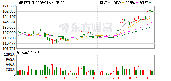 花旗亦强调,百度展现出其芯片、云端、模型及智能体全栈结合技术能力,自研昆仑芯芯片、云基础设 施、文心大模型家族及千帆智能体平台等,已构成出高性能的专有AI基础设施。目前百度智能体基础 设施服务超过46万客户,百度智能云亦服务超过65%的国有企业及系统性银行、95%的主流车厂以及 50%的游戏公司,该行认为百度已做好准备持续提升其专有AI智能水平,给予百度美股目标价186美 元,维持"买入"评级。(格隆汇) | BIDU 百度 | | | | --- | --- | --- | | 162.520 ↑ +0.240 +0.15% | | 收盘价 01/22 16:00 美东 | | 164.090 ↑ 1.570 +0.97% | | 盘前价 01/23 04:17 美东 | | 一 5 24 5 S 0 同 0 | | ● 快捷交易 | | 最高价 165.300 | 开盘价 164.360 | 成交量 316.75万 | | 最低价 160.300 | 昨收价 162.280 | 成交额 5.16亿 | | 平均价 163.031 | 市盈率 M 43.29 | 总市值 558.7亿 (-- ) | | 振 ...
