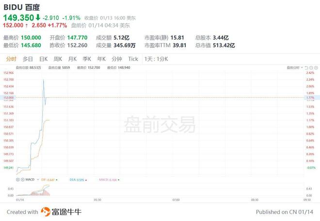 格隆汇1月14日|百度(BIDU.US)盘前拉升涨超2%报152.7美元。有媒体援引知情人士透露,百度正在考 虑将其在香港的上市地位升级为主要上市(primary listing),以增加来自中国内地投资者的敞口,并为可 能不利的美国政策提前做好防范。百度目前在纳斯达克上市,并在香港进行第二上市。 这一安排提升了其在亚洲市场的可投资性,但由于尚未符合"沪深港通"资格,内地投资者仍无法直接参 与交易。若转为主要上市,百度将有望符合跨境交易条件,从而打通内地资金流向香港的投资通道。知 情人士称,随着百度计划推动旗下从事数据中心及人工智能芯片业务的子公司昆仑芯上市,相关讨论已 明显升温。 | 最高价 150.000 | | 开盘价 147.770 | 成交额 5.12亿 | 市盈率(静) 15.81 | 总股本 3.44亿 | | | | --- | --- | --- | --- | --- | --- | --- | --- | | 最低价 145.680 | | 昨收价 152.260 | 成交量 345.69万 | 市盈率TM 39.81 | 总市值 513.42亿 | | | | | | 分时 多日 日K ...
