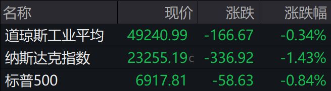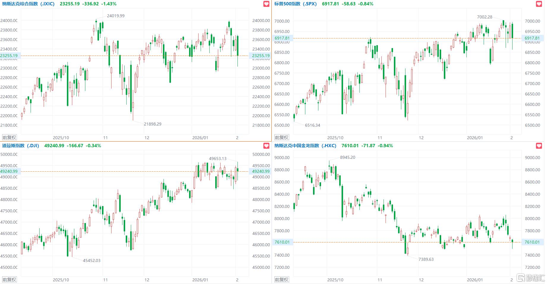 Market Overview - The Dow Jones Industrial Average increased by 0.43% to 49,454.63, while the Nasdaq Index decreased by 0.17% to 23,215.58, and the S&P 500 rose slightly by 0.07% to 6,922.99 [1] - The Nasdaq 100 saw a decline of 0.40% to 25,238.22 [1] Major Technology Stocks - AMD experienced a significant drop of 11.00% [2] - SanDisk fell by 6.89% [2] - Oracle decreased by 3.72% [2] - Facebook (Meta Platforms) declined by 1.46% [2] - Broadcom saw a decrease of 1.16% [2] - NVIDIA and Amazon also experienced minor declines of 0.67% and 0.33% respectively [2] Chinese Concept Stocks - Major Chinese concept stocks collectively declined, with Kingsoft Cloud dropping over 5% [3] - Ctrip Group, NetEase, and Bilibili each fell by over 4% [3] - Baidu Group and Futu Holdings decreased by over 3% [3] Detailed Performance of Chinese Stocks - Kingsoft Cloud fell by 5.45% to 12.414 [4] - Ctrip Group decreased by 4.84% to 57.550 [4] - NetEase dropped by 4.20% to 122.970 [4] - Baidu Group declined by 3.60% to 139.640 [4] - Futu Holdings decreased by 3.52% to 154.155 [4] - Other notable declines include XPeng Motors (-2.10%), Tencent Music (-1.98%), and JD Group (-1.41%) [4]