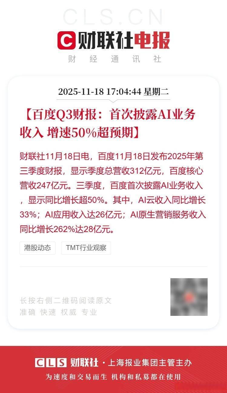 来源:第一财经 在人工智能浪潮席卷全球的今天,百度正以一种前所未有的激进姿态,全力冲向AI时代。 11月18日晚,百度发布2025年第三季度财报,显示季度总营收312亿元,百度核心营收247亿元。百度还首次披露了AI业务的详细收入。其中,AI云收入 同比增长33%,AI应用收入达26亿元,AI原生营销服务收入同比增长262%达28亿元。 "第三季度,我们全方位展示了AI为业务带来的变革性价值。得益于越来越多的企业采用我们的AI产品和解决方案,AI云保持了稳健的增长势头;萝卜快 跑全无人运营规模加速扩大,全球化脚步加快,已进入瑞士市场,同时保持了行业领先的安全标准;在移动生态中,智能体和数字人等AI原生商业化产 品带来快速的收入增长,显示出强大的长期潜力。"百度创始人李彦宏今日表示,将继续开拓人工智能创新,为用户、企业和社会创造巨大价值,巩固百 度在AI时代的领导地位。 AI 时代的复杂竞争,本质是底层能力与上层应用的双重较量。财报数据显示,百度多年搭建的全栈 AI 体系进入收获期。 向下扎根,百度的技术底座构建了难以复制的竞争壁垒。作为 AI 时代的"算力心脏",昆仑芯的迭代速度印证百度的硬科技实力。在 20 ...
