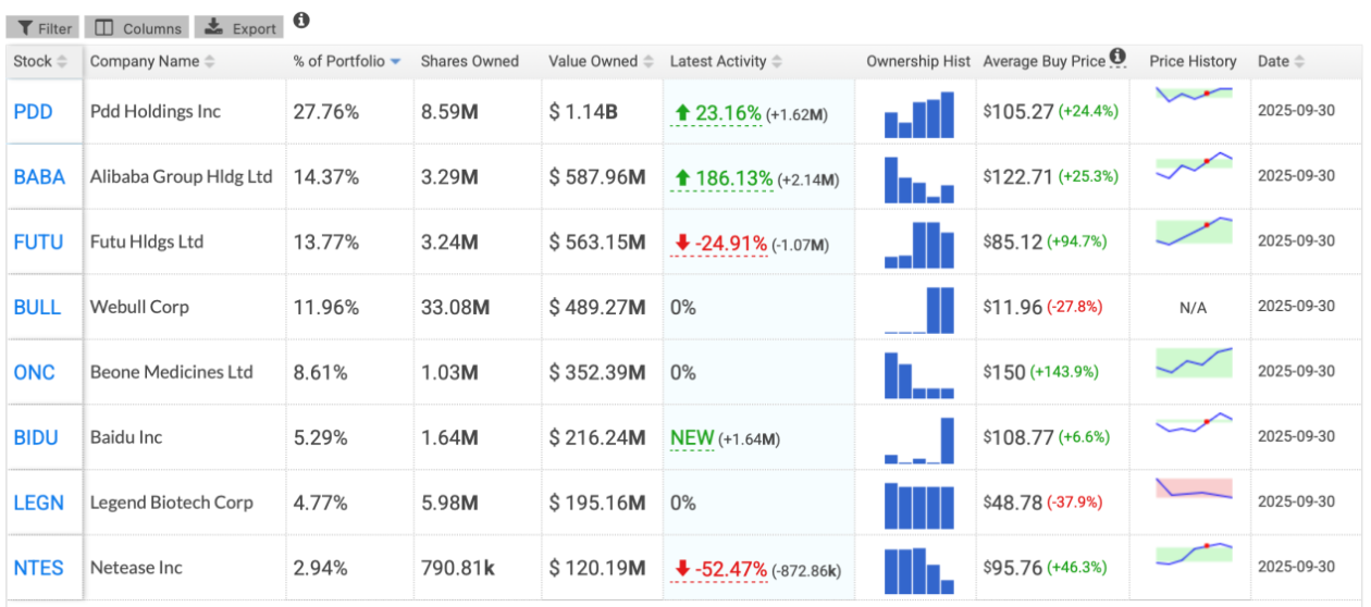【环球网财经综合报道】随着美股机构投资者2025年第三季度持仓数据(13F)陆续披露,高瓴、景林、高毅、东方港湾等中资私募机构的海外投资动向浮 出水面。 高瓴旗下专注于二级市场投资的基金管理平台HHLR Advisors发布了截至2025年三季度末的美股持仓报告。数据显示,截至三季度末,HHLR Advisors共持 有33只美股,持仓总市值达41亿美元,较二季度增加9.9亿美元,增幅为32%。 | T Filter | Columns Export | a | | | | | | | --- | --- | --- | --- | --- | --- | --- | --- | | Stock = | Company Name = | % of Portfolio ▼ | Shares Owned | Value Owned = Latest Activity = | | Ownership Hist Average Buy Price | Price I | | PDD | Pdd Holdings Inc | 27.76% | 8.59M | $ 1.14B | ↑ 23.16% (+1.62M) | ...
