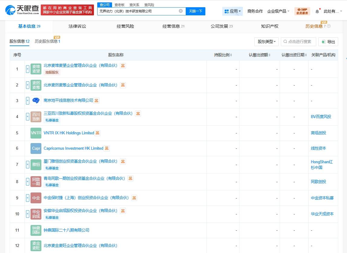 | | 查公司 查老板 查关系 查风险 | | | | --- | --- | --- | --- | | 2天眼查 都在用的商业查询工 - TianYanCha.com 国家中小企业发展子基金旗下机构 | 无界动力 (北京) 技术研发有限公司 | 83 天眼一下 | 脂 应用 ▼ | | 基本信息 29 | 法律诉讼 | 经营风险 | 经营信息 21 公司发展 23 | | --- | --- | --- | --- | | 工商信息 ● | | | | | 工商信息 历史工商信息0 | | | | | 企业名称 | 无界动力(北京)技术研发有限公司 | | | | 法定代表人 | 张 张玉峰 器关联企业 4 | 登记状态 2 | 存续 天眼 | | | | 成立日期 | 2025-03-21 | | 统一社会信用代码 2 | 91110108MAEFMC7B3D | 注册资本 2 | 14.198241万人民币 दे से | | 工商注册号 | 110108043920161 | 纳税人识别号 2 | 91110108MAEFMC7B3D 相行 | | 营业期限 | 2025-03-21 全 元固定期限 ...