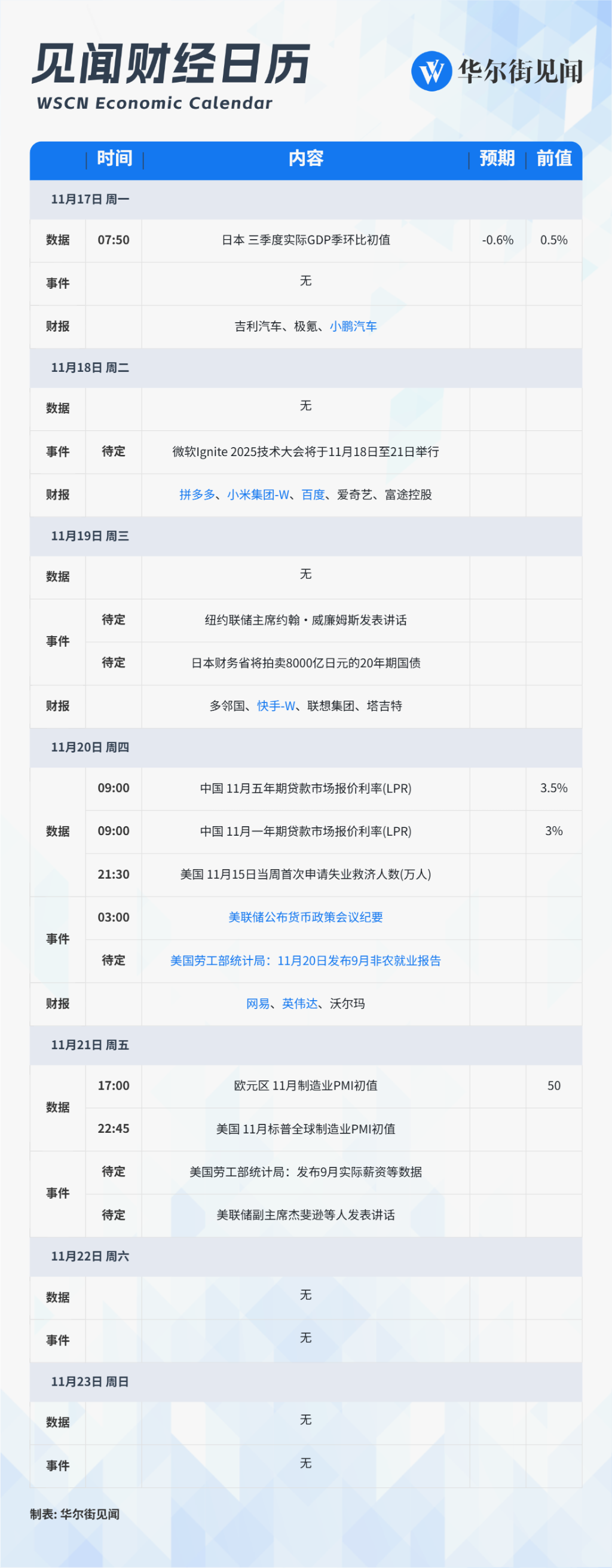 | 03:00 事件 | 美联储公布货币政策会议纪要 | | | --- | --- | --- | | 待定 | 美国劳工部统计局:11月20日发布9月非农就业报告 | | | 财报 | 网易、英伟达、沃尔玛 | | | 11月21日 周五 | | | | 17:00 数据 | 欧元区 11月制造业PMI初值 | 50 | | 22:45 | 美国 11月标普全球制造业PMI初值 | | | 待定 事件 | 美国劳工部统计局:发布9月实际薪资等数据 | | | 待定 | 美联储副主席杰斐逊等人发表讲话 | | | 11月22日 周六 | | | | 数据 | 元 | | | 事件 | 元 | | | 11月23日 周日 | | | | 数据 | 元 | | | 事件 | 元 | | | 制表: 华尔街见闻 | | | 11月17日 - 11月23日当周重磅财经事件一览,以下均为北京时间: 见闻财经日历 WSCN Economic Calendar v 华尔街见闻 | 时间 | | 内容 | 预期 | 前值 | | --- | --- | --- | --- | --- | | 11月17日 周一 | | | ...