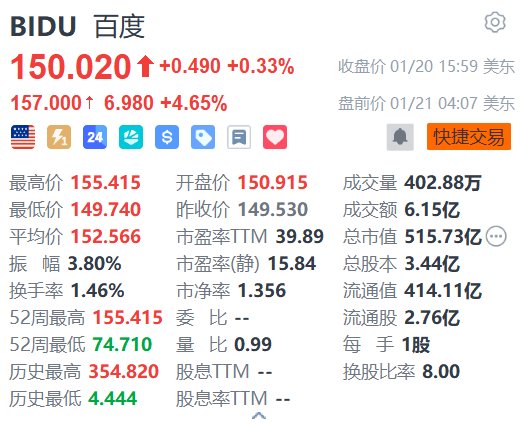 美股异动丨百度盘前涨超4% 多家大行看好其Q4业绩