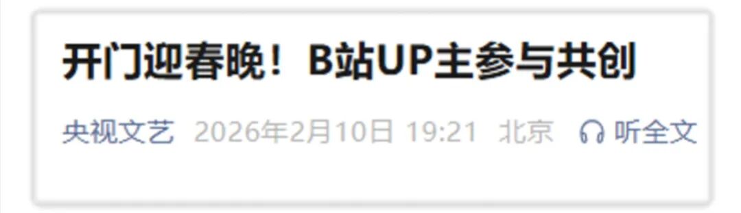 Group 1 - The core point of the article is the collaboration between the Central Radio and Television Station and Bilibili (B站) for the 2026 Spring Festival Gala, marking the first time that UP creators from Bilibili will participate in the event [1] - Bilibili representatives stated that the participating UP creators have an average age of under 30 and represent various fields such as knowledge popularization, lifestyle entertainment, and youth culture [1] - The committee member from the Broadcasting and Television Network Audio-Visual Professional Committee highlighted that Bilibili UP creators are generally young, highly educated, and deeply engaged in their areas of interest, making them well-suited to connect with the younger audience [1] Group 2 - The collaboration aims to bring more youthful content to the Spring Festival Gala, enhancing its appeal to younger generations and creating a shared cultural memory [1]