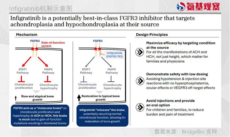 侏儒症的治疗,正迎来被全面颠覆的时刻。 作为最常见的侏儒症类型,软骨发育不全(ACH)过去很长时间无特效疗法,直到2021年,"孤儿药之王"BioMarin研 发的Vosoritide,作为首个获批药物,才开启了药物对症治疗时代。凭借独家优势,其2025年销售额高达9.27亿美元。 但这种垄断格局,即将被打破,多款在研新药正从作用机制到给药方式,向Vosoritide发起挑战。Ascendis的TransCon- CNP通过包裹技术延长了药物作用时间,实现了周剂给药,目前正处于FDA审批阶段;而BridgeBio的口服药 Infigratinib,则从作用机制到用药体验实现全面突破。 Infigratinib靶向的FGFR3(成纤维细胞生长因子受体3)正是驱动ACH疾病发生的关键靶点,2月12日,BridgeBio公布 Infigratinib在ACH中取得的首个具有统计学显著改善意义的3期顶线结果,公司计划下半年向FDA提交新药申请。 获批后的长期扩展临床数据显示,Vosoritide的生长促进效应可持续至少7年。 尽管目前全球仅有5000名婴幼儿使用该药,但罕见病药物的高定价模式,叠加长期持续给药的治疗需 ...