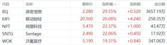 中概股收盘涨幅居前的个股为:波奇宠物涨29.55%,移动财经涨26.08%,网塑科技涨22.37%,Sentage 涨22.06%,沃氪医疗涨19.31%。(格隆汇) | 代码 | 名称 | 最新价 | 涨跌幅√ | 涨跌额 | 成交额 | | --- | --- | --- | --- | --- | --- | | BQ | 波奇宠物 | 2.280 | 29.55% | +0.520 | 3657.19万 | | MFI | 移动财经 | 20.500 | 26.08% | +4.240 | 258.35万 | | NPT | 网塑科技 | 5.470 | 22.37% | +1.000 | 43.47万 | | SNTG | Sentage | 2.490 | 22.06% | +0.450 | 17.92万 | | WOK | 沃氪医疗 | 5.190 | 19.31% | +0.840 | 347.06万 | ...