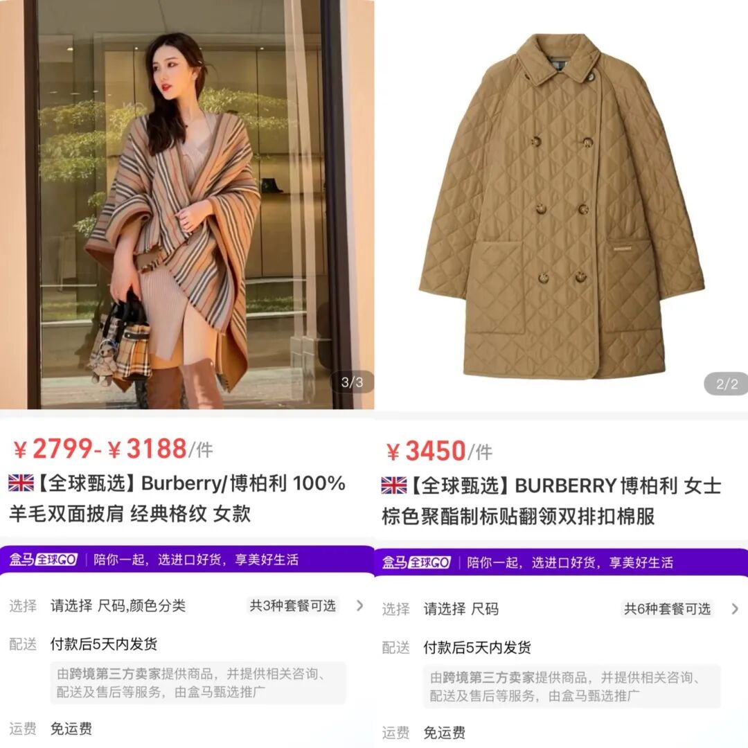 | 盒马经现CO 陪你一起,选进口好货,享美好生活 | | 盒马全球GO 陪你一起,选进口好货,享美好生活 | | | --- | --- | --- | --- | | 选择 请选择 尺码,颜色分类 共3种套餐可选 | ) | 选择 请选择 尺码 共6种套餐可选 | > | | 配送 付款后5天内发货 | | 配送 付款后5天内发货 | | | 由跨境第三方卖家提供商品,并提供相关咨询、 配送及售后等服务,由盒马甄选推广 | | 由跨境第三方卖家提供商品,并提供相关咨询, 配送及售后等服务,由盒马甄选推广 | | | 云费 免云费 | | 一品 分子用 | | 图源:盒马APP 卖生鲜的盒马,也卖起了奢侈品? 近日,盒马APP上架奢侈品牌Burberry,涉及服装、包袋、鞋子、围巾、披肩等多个品类。其中,售价最高的服装是一件长款风衣,价格达到4199元;售 价最高的箱包是一款中号牛皮水桶包,价格为3766元。 根据详情页面,Burberry商品属于盒马旗下跨境零售业务"全球购"全球甄选系列,由境外第三方卖家通过跨境电商平台(tao-bao.com)出售,盒马甄选则 负责推广,消费者在付款后5天,订单从法国巴 ...
