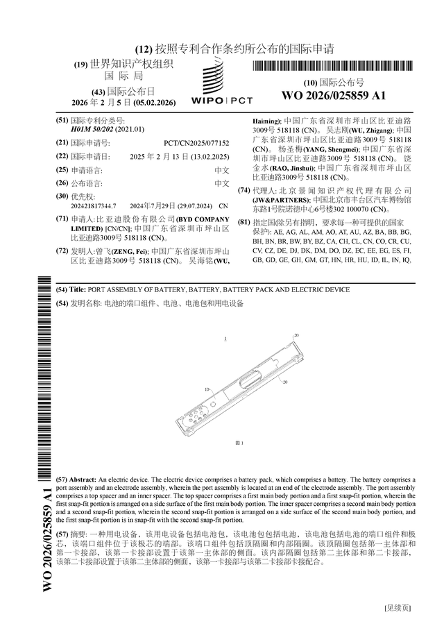 比亚迪公布国际专利申请:“电池的端口组件、电池、电池包和用电设备”