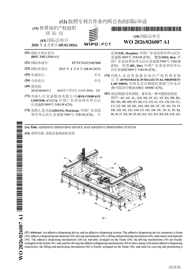 比亚迪公布国际专利申请:“涂胶设备和涂胶系统”