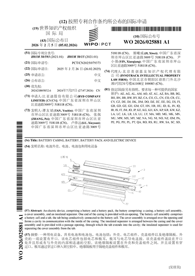比亚迪公布国际专利申请:“电池外壳、电池、电池包和用电设备”