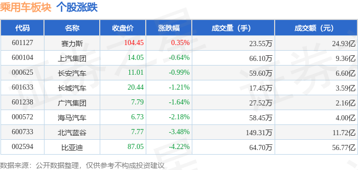 证券之星消息,2月2日乘用车板块较上一交易日下跌1.96%,比亚迪领跌。当日上证指数报收于4015.75,下跌2.48%。深证成指报收于13824.35, 下跌2.69%。乘用车板块个股涨跌见下表: | 代码 | 名称 | 收盘价 | 涨跌幅 | 成交量(手) | 成交额(元) | | --- | --- | --- | --- | --- | --- | | 601127 | 赛力斯 | 104.45 | 0.35% | 23.55万 | 24.93亿 | | 600104 | 上汽集团 | 14.05 | -0.64% | 66.10万 | · 9.36 Z | | 000625 | 长安汽车 | 11.01 | -0.99% | 59.60万 | 6.60亿 | | 601633 | 长城汽车 | 20.44 | -1.21% | 17.45万 | 3.59亿 | | 601238 | 广汽集团 | 7.79 | -1.64% | 27.52万 | 2.16亿 | | 000572 | 海马汽车 | 6.73 | -2.18% | 58.45万 | 4.00亿 | | 600733 | 北汽蓝谷 | 7 ...