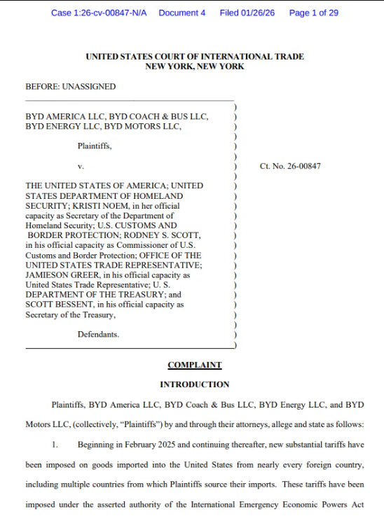 1000余家企业也在同步起诉。 近日,美国国际贸易法院披露,比亚迪美国多家子公司已于1月26日发起诉讼,指控美国政府多项关税 政策不合法,并要求退还税款。 此前2025年,特朗普政府上台后援引美国《国际紧急经济权力法》(IEEPA),以不经过国会批准、直 接颁布行政令的方式出台一系列加征关税措施,而这些关税措施在美国国内引发了一系列法律诉讼。 第一财经获取的比亚迪相关诉讼文件中明确,此次诉讼特别针对IEEPA 对比亚迪进口商品征收关税的行 为。诉讼的主要内容是请求法院认定美国政府对比亚迪征收的所有IEEPA关税均属越权征收,美国政府 应全额退还所有相关钱款。 此次诉讼中,比亚迪在诉讼文件中表示,公司已缴纳 IEEPA 项下关税,唯有通过独立诉讼及司法救 济,方能确保非法征收的关税得以退还。且公司仍在为持续清关的进口货物缴纳相关关税,相关税款已 具法律终局性,故提起本案独立诉讼确有必要。 比亚迪认为,此前美国国际贸易法院、联邦巡回上诉法院均裁定,IEEPA并没有授权美国总统征收上述 关税。而比亚迪已支付了多项IEEPA关税,这些税款正在持续结关清算,因此可能在法律上成为定案, 如果不采取行动,可能会影响到后续关 ...