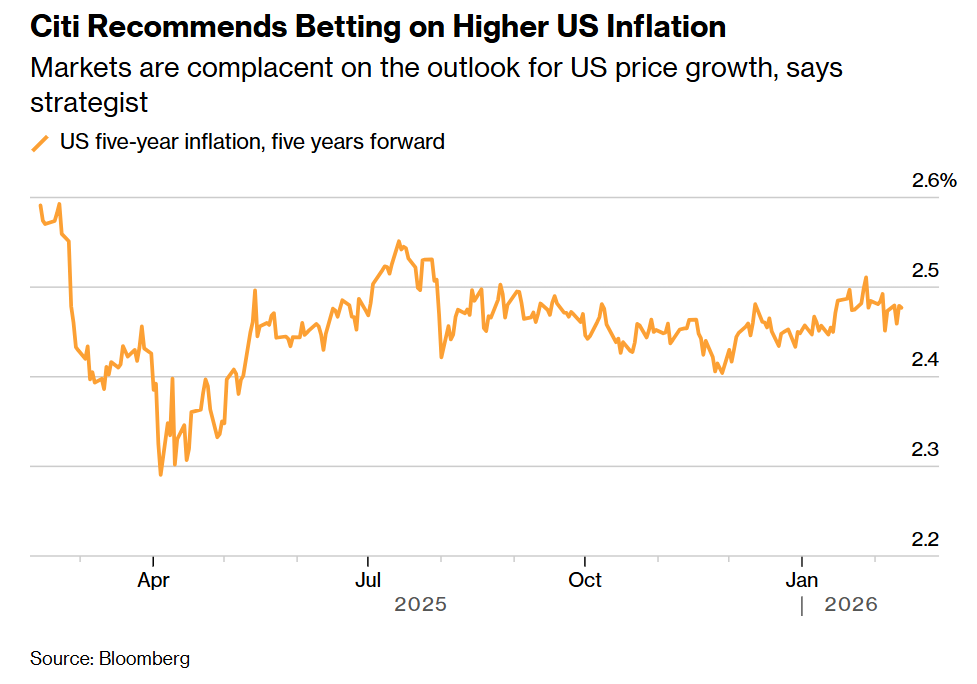 Group 1 - The core viewpoint of the article is that the market is overly complacent about the U.S. inflation outlook, making bets on rising inflation pressures significantly attractive [1] - Citigroup's rate trading strategist Benjamin Wiltshire suggests that investors may be underestimating the resilience of U.S. consumption, leading to a likely slight upward revision of market inflation expectations [1] - Wiltshire recommends buying five-year/five-year forward inflation derivatives, arguing that the current pricing level of about 2.5% is too low compared to the persistent core inflation indicator, which remains just below 3% [1] Group 2 - Recent strong U.S. employment data has exceeded market expectations, causing a surge in U.S. Treasury yields and prompting traders to lower their expectations for Federal Reserve rate cuts this year [4] - The market's reluctance to price in inflation risks is attributed to disappointment over last year's U.S. tariff policies not quickly translating into inflation [4] - Wall Street remains vigilant about inflationary risks, anticipating that a strong economic recovery in the U.S. could reignite price increases, especially if the next Federal Reserve chair, likely to be Waller, guides policymakers to lower rates more aggressively [4] Group 3 - UBS Group AG's senior trader Ben Pearson indicates that the "inflationary boom" led by the U.S. is one of the most underestimated risks by investors this year [4] - If inflationary pressures materialize, the Federal Reserve may remain inactive in the first half of the year, forcing the market to price in rate hikes for the second half [5] - Lazard's CEO argues that it is reasonable and likely for U.S. inflation to return above 4% by the end of the year [5] Group 4 - The complexity of predicting inflation has increased due to tariff tensions and rapid advancements in emerging technologies [5] - Investors must also contend with geopolitical risks affecting oil prices, particularly from intermittent threats related to Iran [5] - BlackRock's Tom Becker has been increasing short positions in long-term U.S. and U.K. government bonds, expecting strong economic growth and rising commodity prices to exert upward pressure on consumer prices [5] Group 5 - In this uncertain environment, TIPS (Treasury Inflation-Protected Securities) offer a potential hedging mechanism against inflation [6] - Vanguard's senior portfolio manager Brian Quigley notes that TIPS are not without risks, particularly if oil prices fall sharply, which could quickly lower the breakeven point for these securities [7] - Pimco views TIPS as inexpensive insurance against inflation, believing they provide good protection if inflation exceeds the Federal Reserve's target, similar to the past four to five years [7]