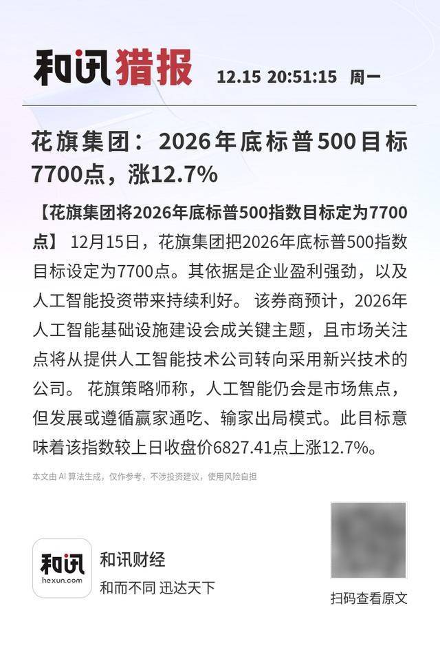 【花旗集团将2026年底标普500指数目标定为7700点】12月15日,花旗集团把2026年底标普500指数目标 设定为7700点。其依据是企业盈利强劲,以及人工智能投资带来持续利好。 该券商预计,2026年人工 智能基础设施建设会成关键主题,且市场关注点将从提供人工智能技术公司转向采用新兴技术的公司。 花旗策略师称,人工智能仍会是市场焦点,但发展或遵循赢家通吃、输家出局模式。此目标意味着该指 数较上日收盘价6827.41点上涨12.7%。 本文由 Al 算法生成,仅作参考,不涉投资建议,使用风险自担 本文由 AI算法生成,仅作参考,不涉投资建议,使用风险自担 和讯财经 和而不同 迅达天下 扫码查看原文 和讯猎报 12.15 20:51:15 周一 花旗集团: 2026年底标普500目标 7700点,涨12.7% 【花旗集团将2026年底标普500指数目标定为7700 点】 12月15日,花旗集团把2026年底标普500指数 目标设定为7700点。其依据是企业盈利强劲,以及 人工智能投资带来持续利好。该券商预计,2026年 人工智能基础设施建设会成关键主题,且市场关注 点将从提供人工智能技术公司转向采用新兴技 ...
