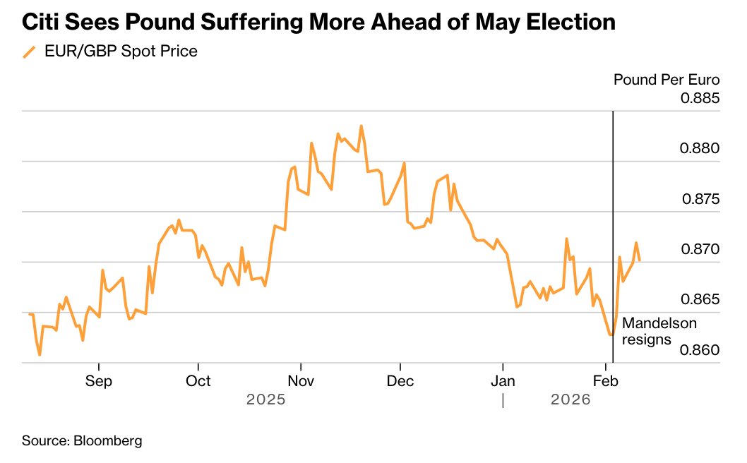 在英镑此前因英国首相斯塔默的核心团队高层辞职而遭受打击后,本周英镑兑美元汇率有所反弹,兑欧元也收复部分失地。由于英镑今年以来的涨幅 很大程度上源于美元走弱,许多策略师认为,欧元兑英镑汇率是表达英国风险的最佳方式。 智通财经APP获悉,花旗集团认为,现在还不是做空英镑的时机,该行将目标锁定在第二季度——届时政治风险上升与降息周期将形成"双重打击", 令英镑承压。花旗策略师丹尼尔·托邦表示,政治风险与降息预期本就是看空英镑的核心逻辑。尽管过去一周市场已"零星感受到这两大风险",但他预 计大规模押注英镑下跌的时机将在5月初地方选举前夕到来。他表示:"4月和5月,这些主题将汇聚在一起,英镑可能会出现更大的反应。这正是我们 希望参与的时点。现在就认真布局这些情境,感觉还为时过早。" 丹尼尔·托邦预计,到6月底英镑将跌至1欧元兑88便士,并在9月底进一步下滑至1欧元兑90便士,而目前约为1欧元兑87便士。这一预测比媒体调查中 策略师对6月底中值预测的1欧元兑88便士更为看空。 期权市场显示,自3月起欧元兑英镑的卖盘将增加,市场预计英国央行届时将实施降息。丹尼尔·托邦预计,英国央行下一次降息将在4月,随后在7月 和11月还 ...